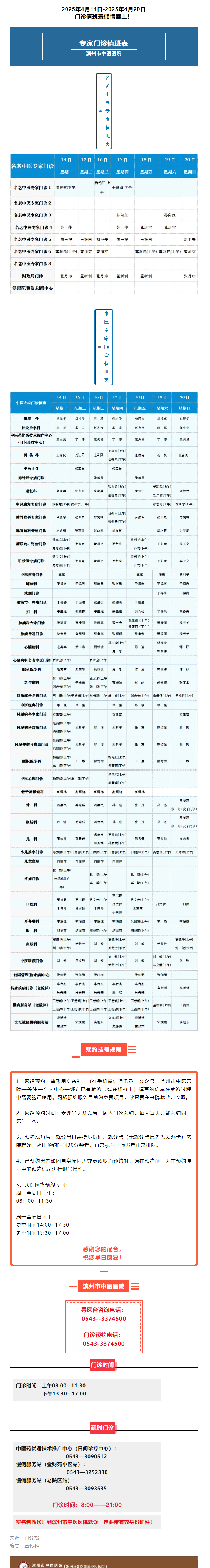 滨州市中医医院(滨州医学院附属中医医院)2025年4月14日-4月20日门诊值班表