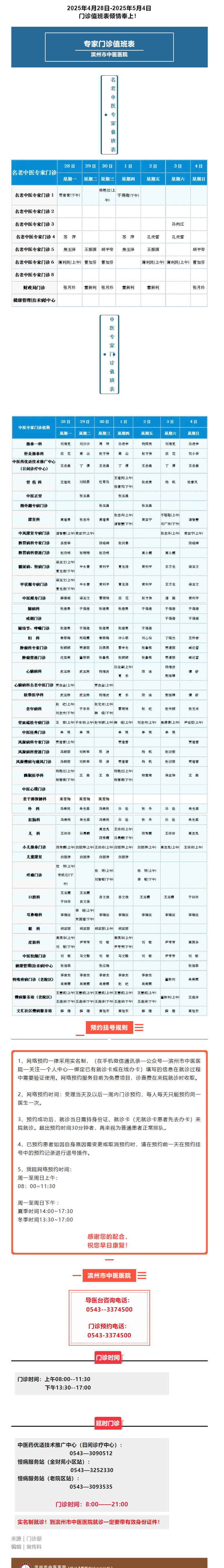 滨州市中医医院(滨州医学院附属中医医院)2025年4月28日-5月4日门诊值班表