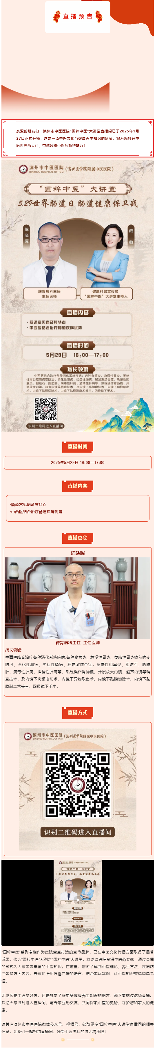 直播预告 | 滨州市中医医院“国粹中医”大讲堂第十五期 5.29世界肠道日 肠道健康保卫战