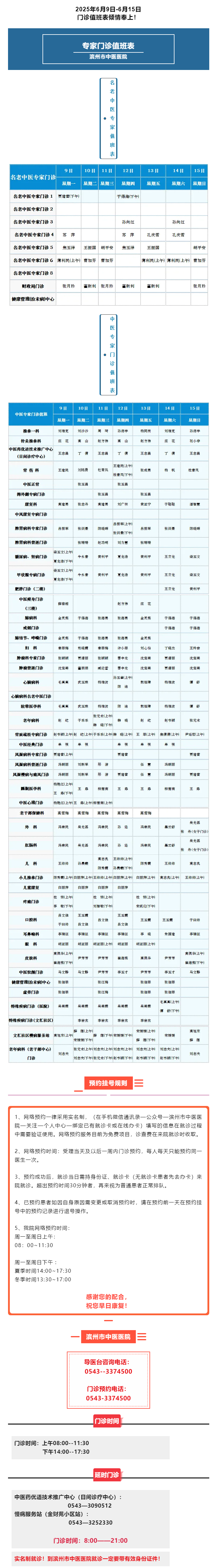 滨州市中医医院(滨州医学院附属中医医院)2025年6月9日-6月15日门诊值班表