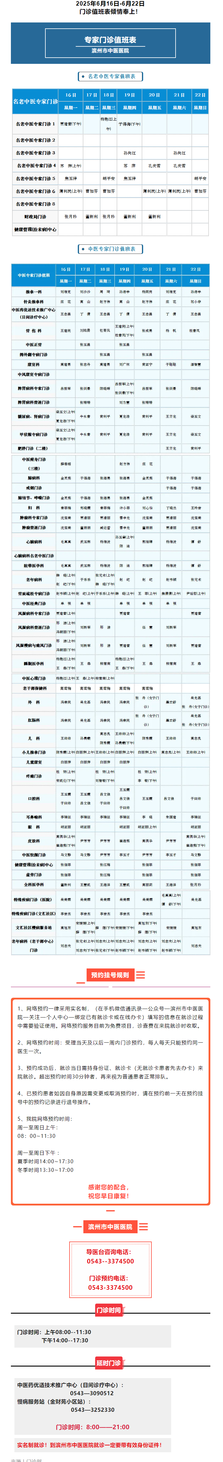 滨州市中医医院(滨州医学院附属中医医院)2025年6月16日-6月22日门诊值班表