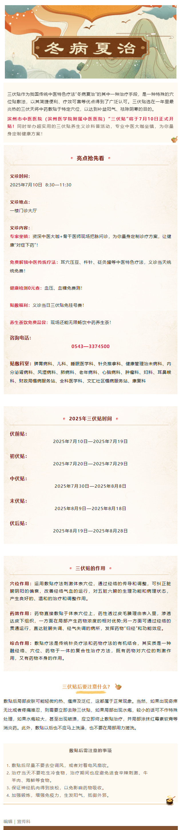 三伏将至,趁热打“贴”,冬病夏治黄金期来啦!滨州市中医医院(滨州医学院附属中医医院)将于7月10日举办三伏贴养生义诊科普活动