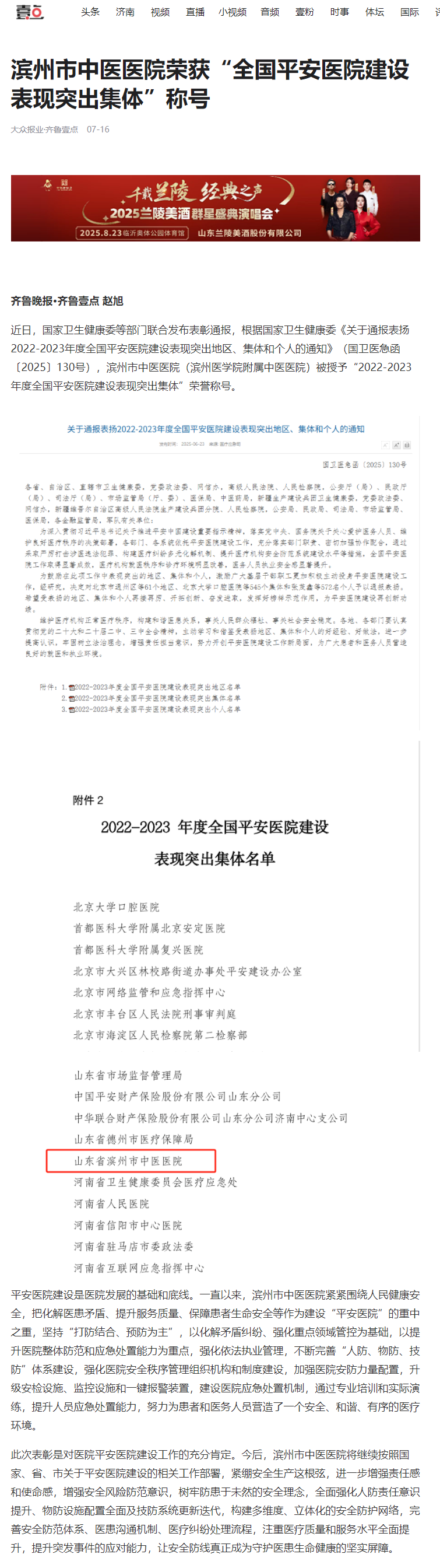 【齐鲁壹点】滨州市中医医院荣获“全国平安医院建设表现突出集体”称号