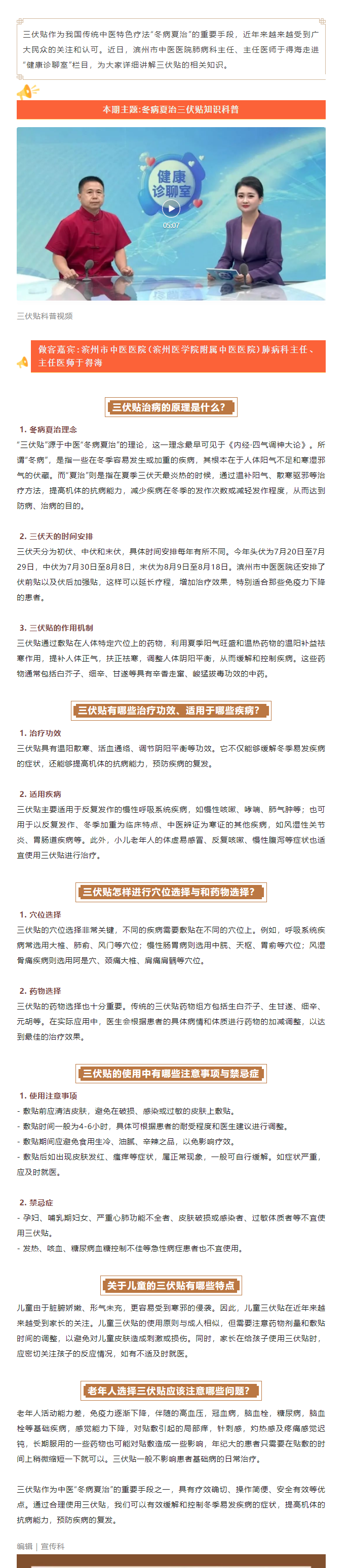 健康诊聊室 | 滨州市中医医院肺病科主任、主任医师于得海做客直播间 冬病夏治三伏贴知识科普