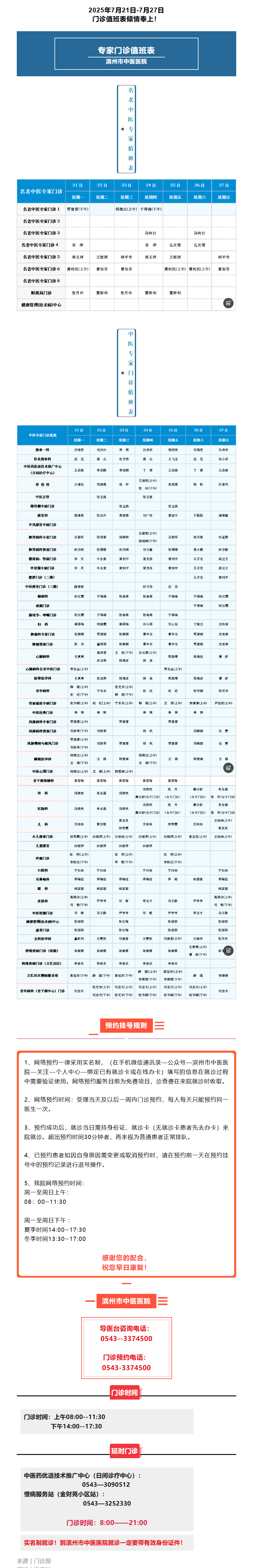 滨州市中医医院(滨州医学院附属中医医院)2025年7月21日-7月27日门诊值班表