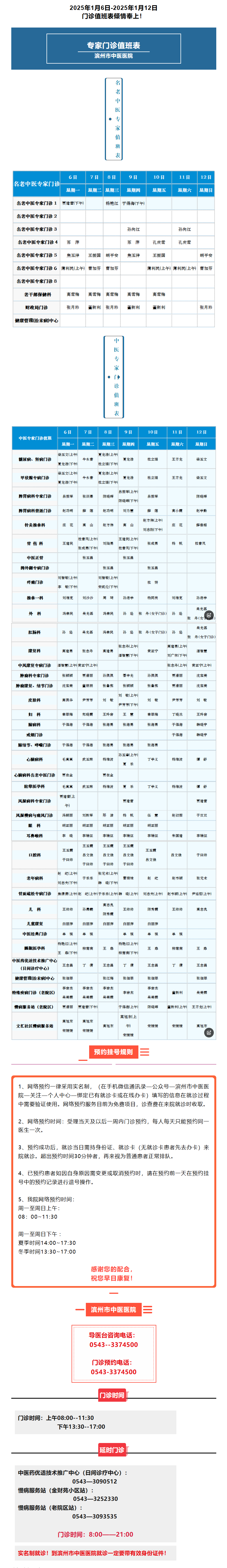 滨州市中医医院(滨州医学院附属中医医院)2025年1月6日-1月12日门诊值班表
