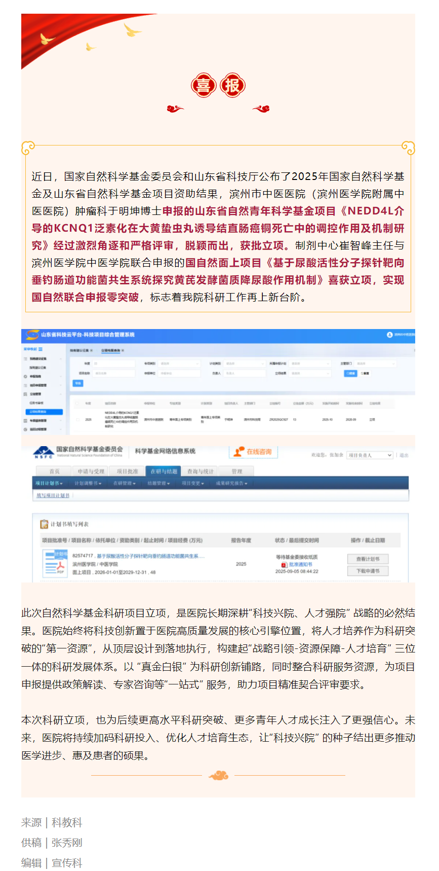 科技兴院 喜结硕果!滨州市中医医院(滨州医学院附属中医医院)再获自然科学基金科研项目立项