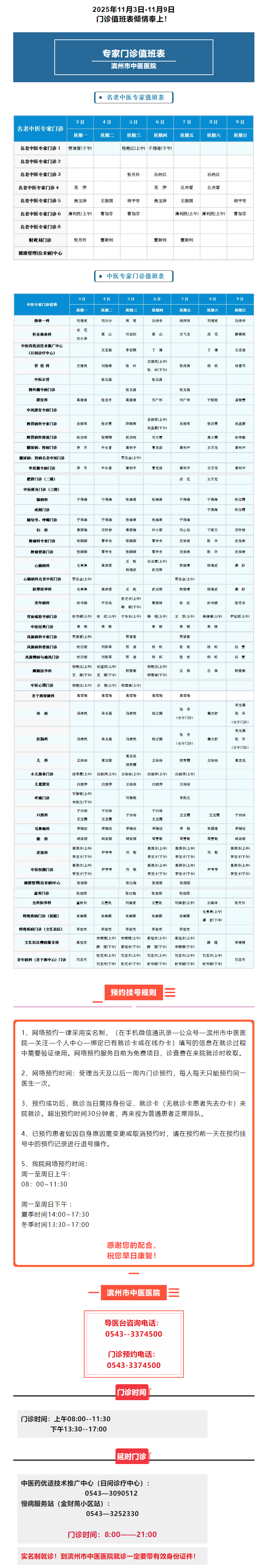 滨州市中医医院(滨州医学院附属中医医院)2025年11月3日-11月9日门诊值班表