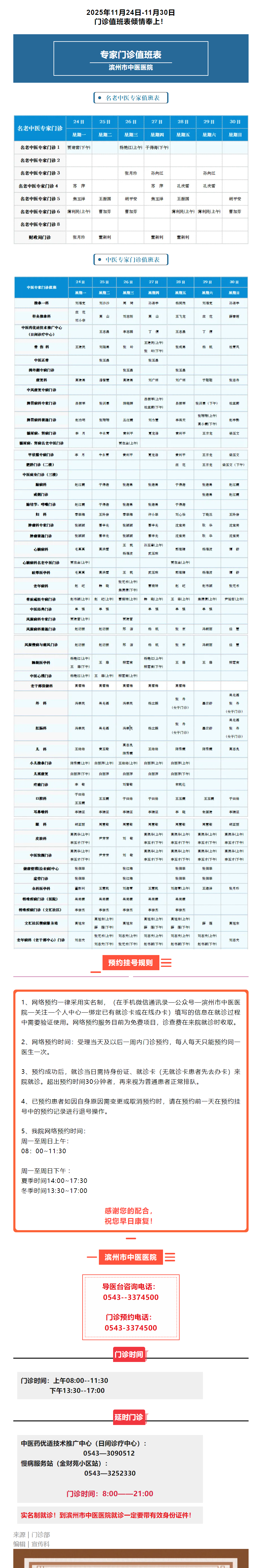 滨州市中医医院(滨州医学院附属中医医院)2025年11月24日-11月30日门诊值班表