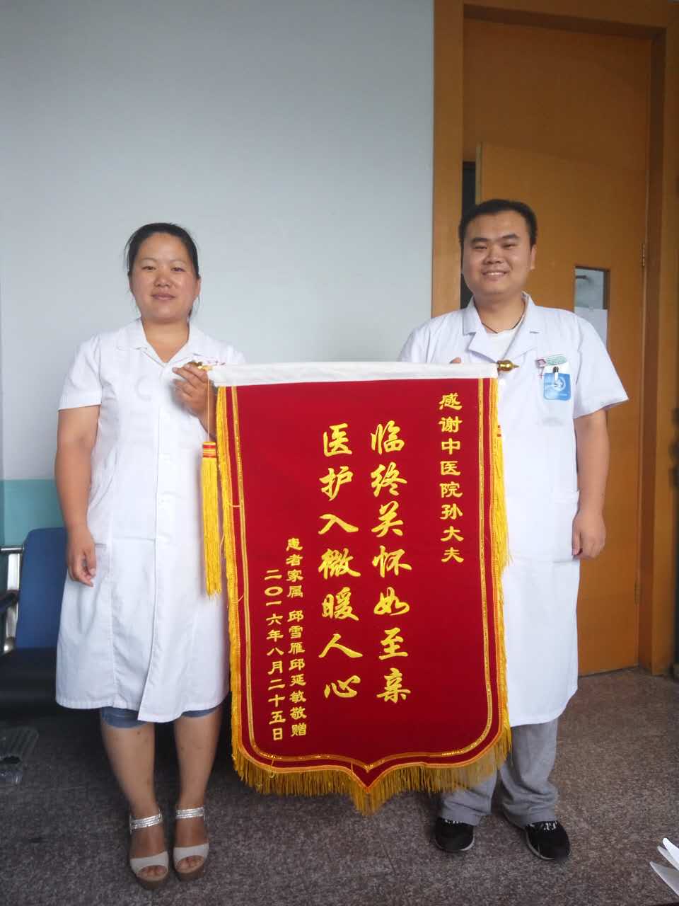 据孙大夫介绍,这几天,一位高新区的癌症患者在其他医院住院后,仍未减轻病痛,于是他选择了我们。他的选择本身就是对我们的一种鼓励和信任。他来的时候已经是膀胱癌晚期,肿瘤压迫直肠,阴囊肿胀得厉害。孙大夫立即进行病情诊断与方案制定,运用中医特色治疗,中药封包治疗患者阴囊水肿及癌痛,中药灌肠胃肠减压术治疗患者腹胀,口服中药调理患者脾胃功能、提高患者免疫力及补液营养对症支持治疗,住院一周,患者病情得到了一定控制,痛苦减轻,生活质量有了明显提高。遗憾的是病人癌症晚期病情太重,一个月后安详离世。患者家属给孙大夫送来了锦旗“临终关怀如至亲,医护入微暖人心”表示感谢,孙大夫却说:“救死扶伤是我的职责,医生不就是奉献嘛。”