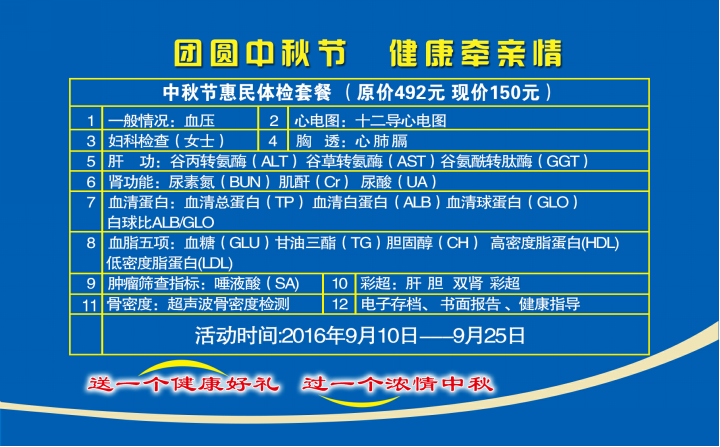 滨州市中医医院中秋优惠体检套餐原价492元,中秋活动优惠价格仅为150元,体检项目主要包括: