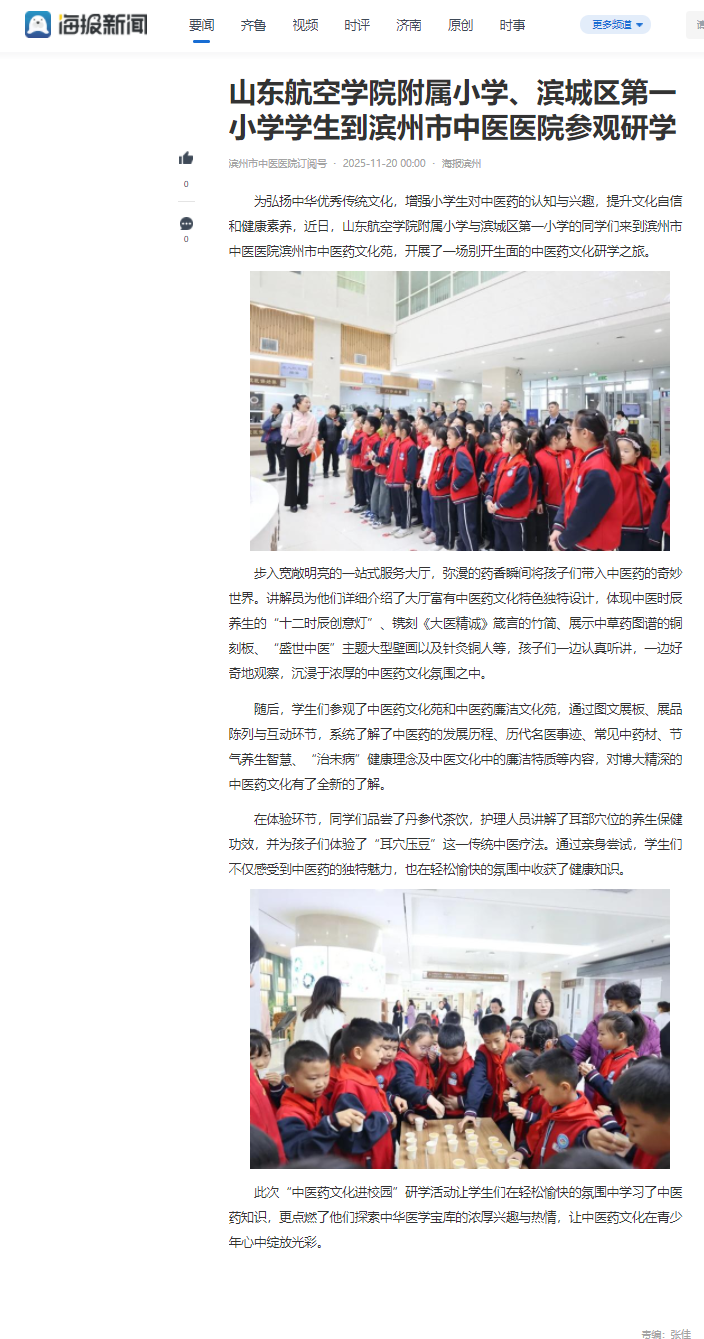 【海报新闻】山东航空学院附属小学、滨城区第一小学学生到滨州市中医医院参观研学