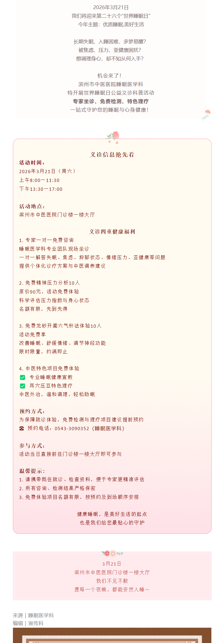 2026世界睡眠日 | 3月21日滨州市中医医院睡眠医学科公益义诊科普来啦!