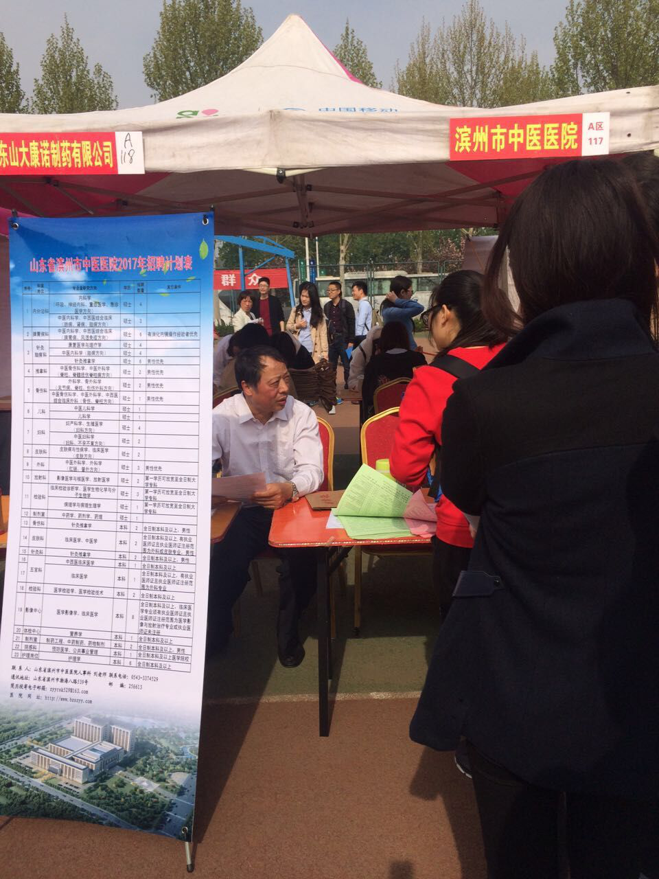 在长春中医药大学2017届毕业生春季供需见面洽谈会现场,上午举行了集中洽谈活动,前来咨询洽谈的同学们积极踊跃,共收到简历53份,其中33位研究生,20位本科生;下午我院召开了专场洽谈会,共有30余位同学参加。院长张永生就滨州市基本情况和我院的发展情况及未来规划向同学们作了详细的介绍,同学们也就各自关心的问题进行了提问,大内科主任贾在金和外科主任冯崇民现场对有意向的同学进行了面试,并与12名研究生、4名本科生达成了试工意向。