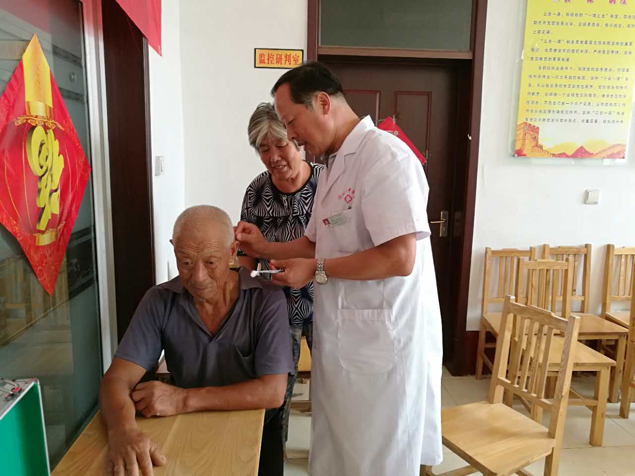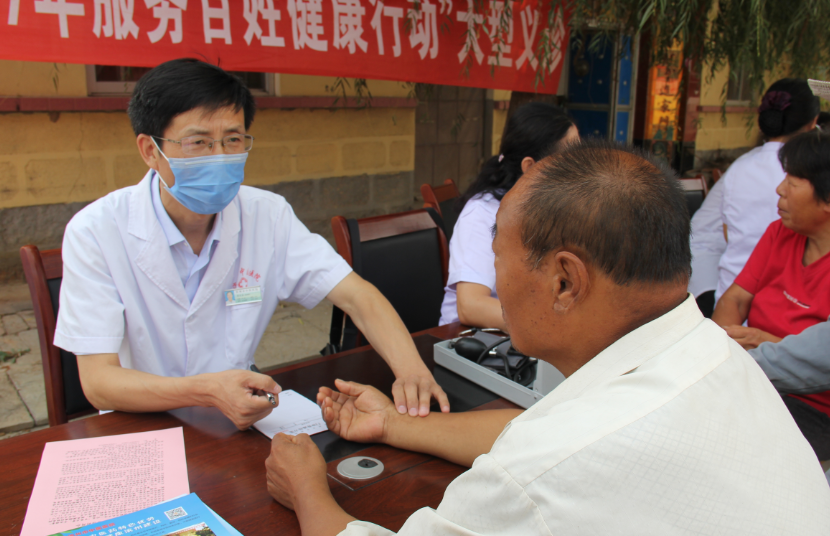 在乔家庄村义诊现场,针灸科焦玉祥主任、脾胃病科吕振军主任、骨伤科胡平安主任为群众进行测量血压、查体,对常见病、慢性病进行初步筛查,积极推广中医未病先防的自我健康管理和生活方式。