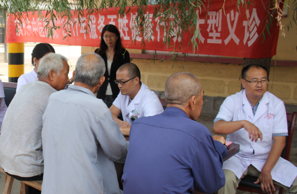 在郭马村义诊现场,干部保健科王振国主任、内分泌科于得海大夫、推拿科夏乐大夫为群众进行现场针灸、测量血压,对一些腰椎、颈椎病患者进行诊治,并提出了合理化治疗建议和健康指导。