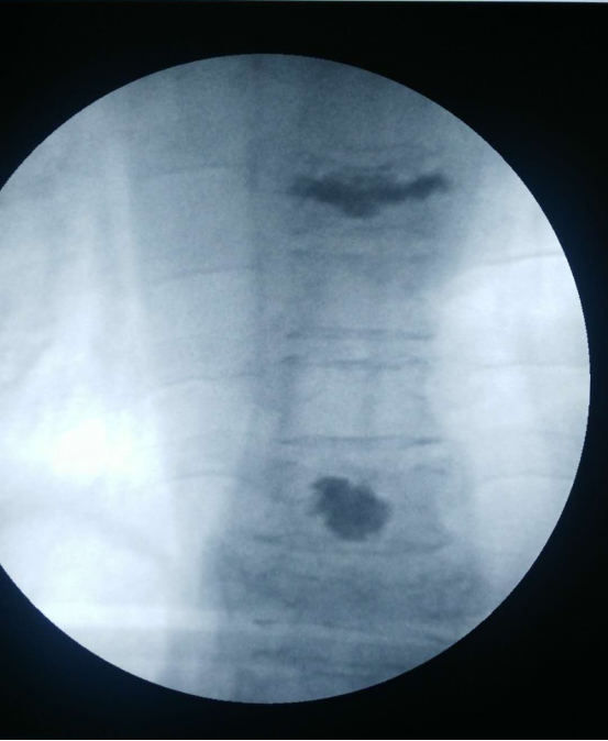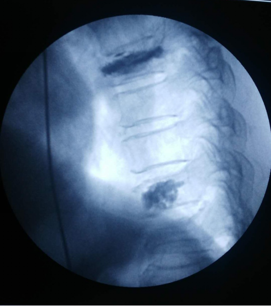 经过细致完备的术前准备,在局麻下为该患者实施了经皮穿刺椎体压缩骨折后凸成型术,在G型臂X光机透视定位目标T7、10椎体,用穿刺针在透视下穿刺入椎体,应用球囊缓慢撑开T7、10椎体,应用专用器械在监测下注入骨水泥T7约5ml,T10约3ml,透视见注入的骨水泥位置、形态良好,术毕,患者安返病房。患者随即感疼痛明显缓解,翻身自如。