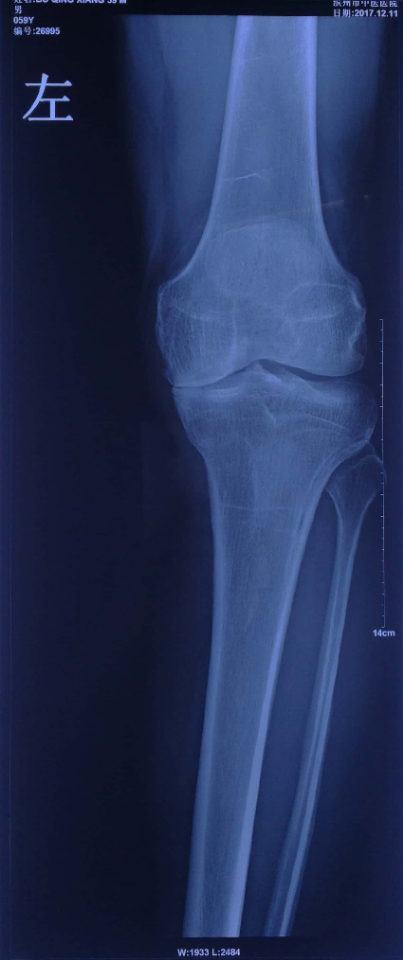 近日,59岁的患者卜先生因左膝关节疼痛而入院。入院后,我院骨伤科对患者进行了详尽检查,发现患者左膝关节存在骨性关节炎、半月板损伤、膝内翻畸形等多种问题。胡平安主任及其团队对患者病情进行分析讨论,一方面认为口服药物或传统的保守治疗无法彻底解决患者膝关节存在的各类问题,另一方面考虑到患者年龄及其对日常生活劳动的需求,患者目前的情况尚不适合行全膝关节置换术。胡平安主任及其团队经过慎重的论证分析,为患者制定了合理有效的手术治疗方案,即先通过膝关节镜探查关节软骨、半月板、交叉韧带的情况,对损伤的半月板进行修整成形,然后行左膝内翻胫骨高位截骨矫形术(HTO术),矫正患者的膝内翻畸形,进一步缓解了患者的病痛。