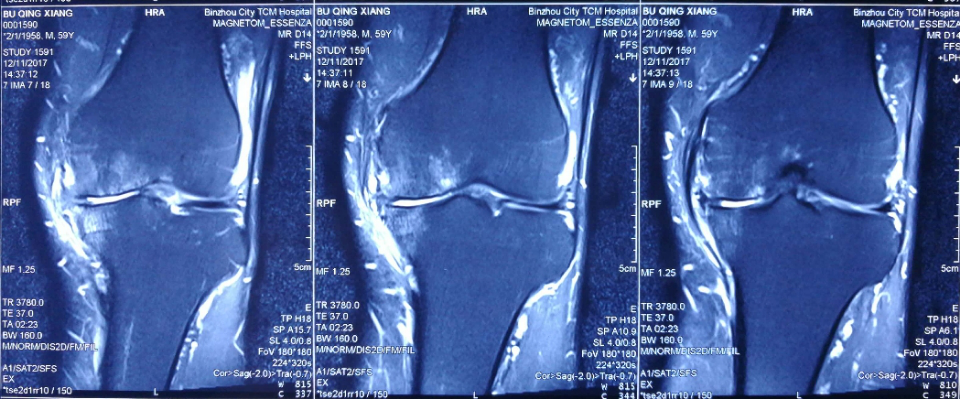 术前MRI显示:患者左膝内侧股骨髁及胫骨平台骨髓水肿及半月板损伤