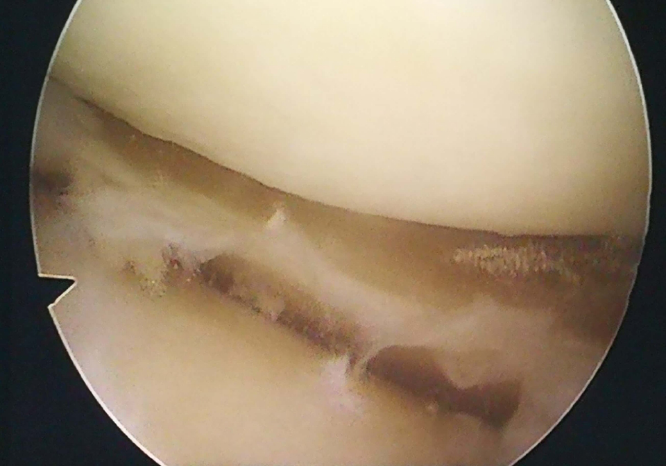 术中关节镜下显示:患者左膝内侧间室软骨剥脱,软骨下骨裸露,外侧间室关节软骨正常,半月板损伤