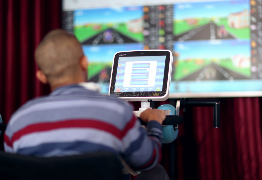 这个设备就更有趣了,名字叫智能康复训练工作站。通过游戏来带动肢体的训练,游戏中会设置障碍、奖励,调动了患者的积极性与主动性,让患者在欢乐的气氛中进行康复训练。智能康复训练工作站是互联网情景互动与KLW-SKF相结合。主要应用于上肢和下肢进行被动性和主动性训练。适用于中风、多发性硬化、截瘫后脊髓灰质炎综合征、帕金森氏症、脑外伤、小儿脑瘫等运动能力减弱的患者。