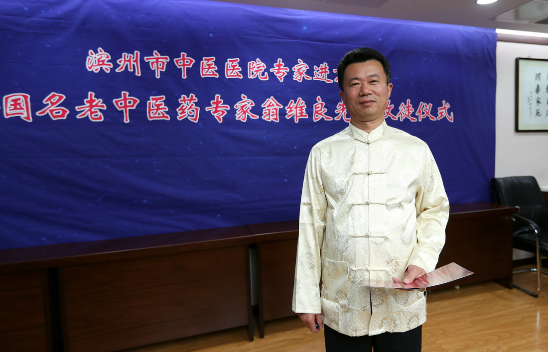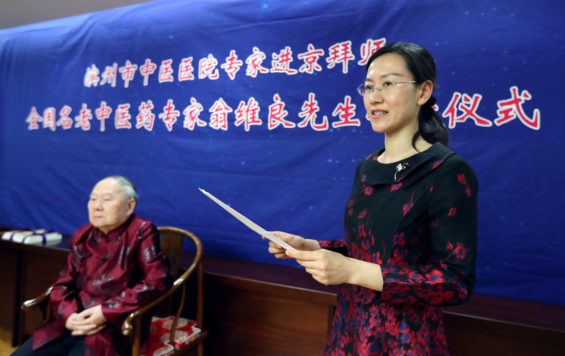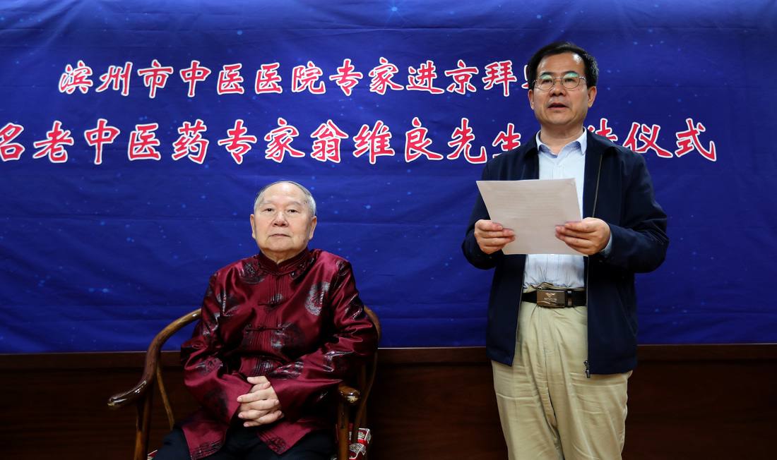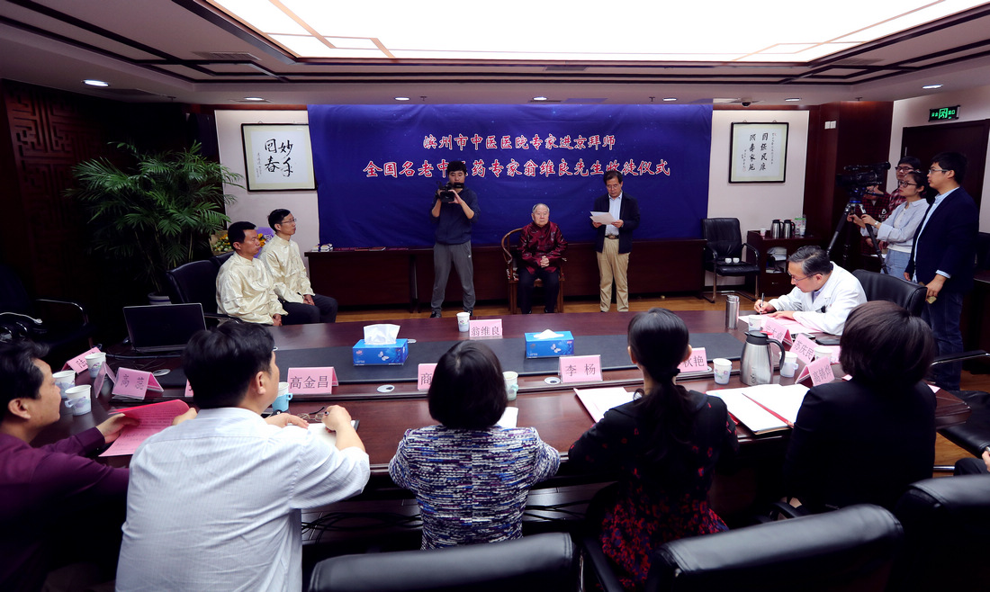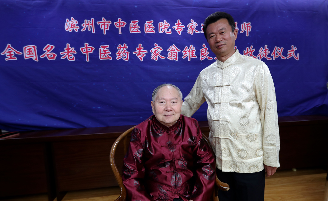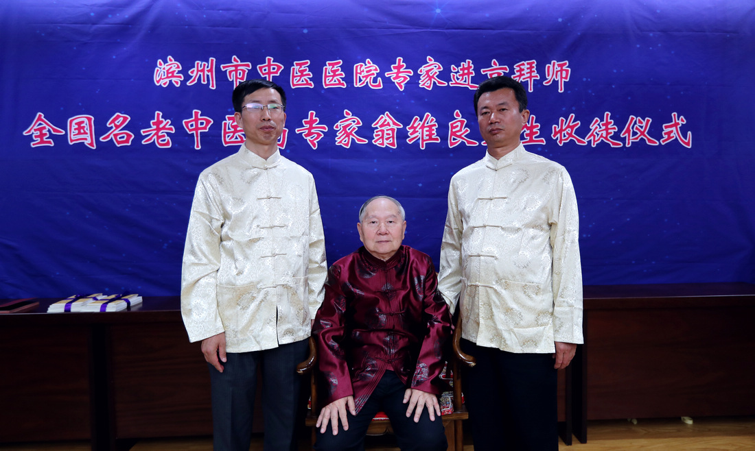 5月9日,滨州市中医医院专家拜师仪式在北京中国中医科学院西苑医院举行。贾在金、吕振军两位滨州中医专家正式拜师81岁高龄的全国名中医、首都国医名师翁维良先生。在滨州市中医医院建立“全国名中医药专家翁维良传承工作室滨州工作站”。中国中医科学院中医药发展研究中心常务副主任苏庆民,滨州市政府副秘书长李杨,滨州市卫生和计划生育委员会党组书记、主任商秀丽,滨州市中医药管理局副局长高金昌,中国中医科学院西苑医院副院长史大卓,中国中医科学院西苑医院副院长李秋艳,中国中医科学院西苑医院教育处处长高铸烨,中国中医科学院西苑医院科研处副处长高蕊、中国中医科学院西苑医院GCP中心副主任陆芳,滨州市中医医院院长张永生,滨州市中医医院副院长杨艳红参加了拜师仪式。