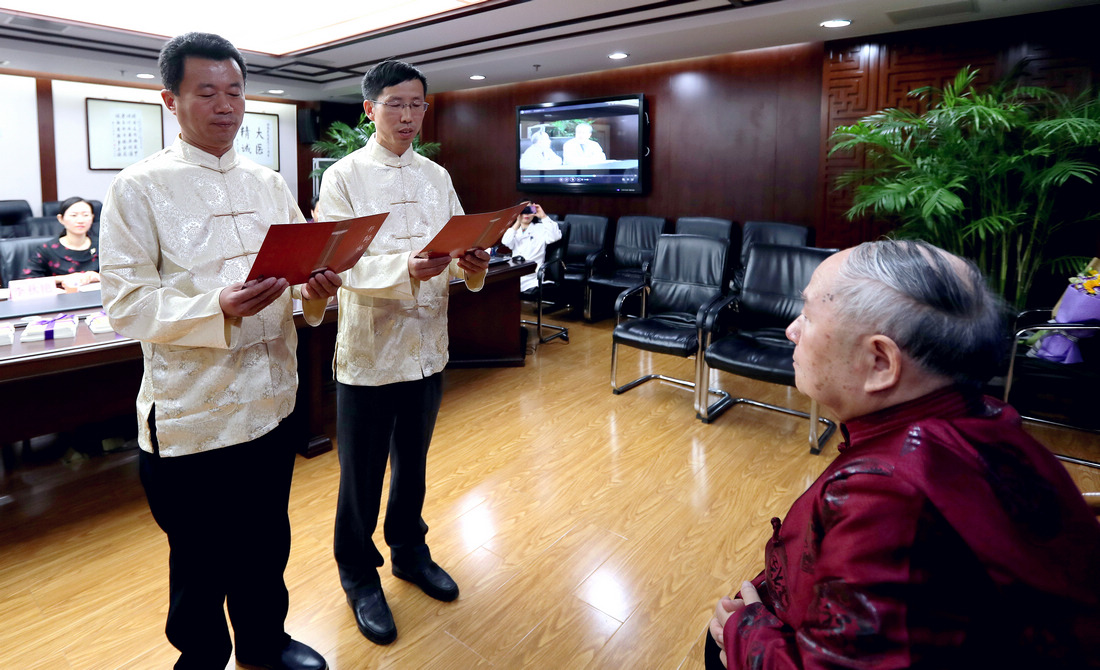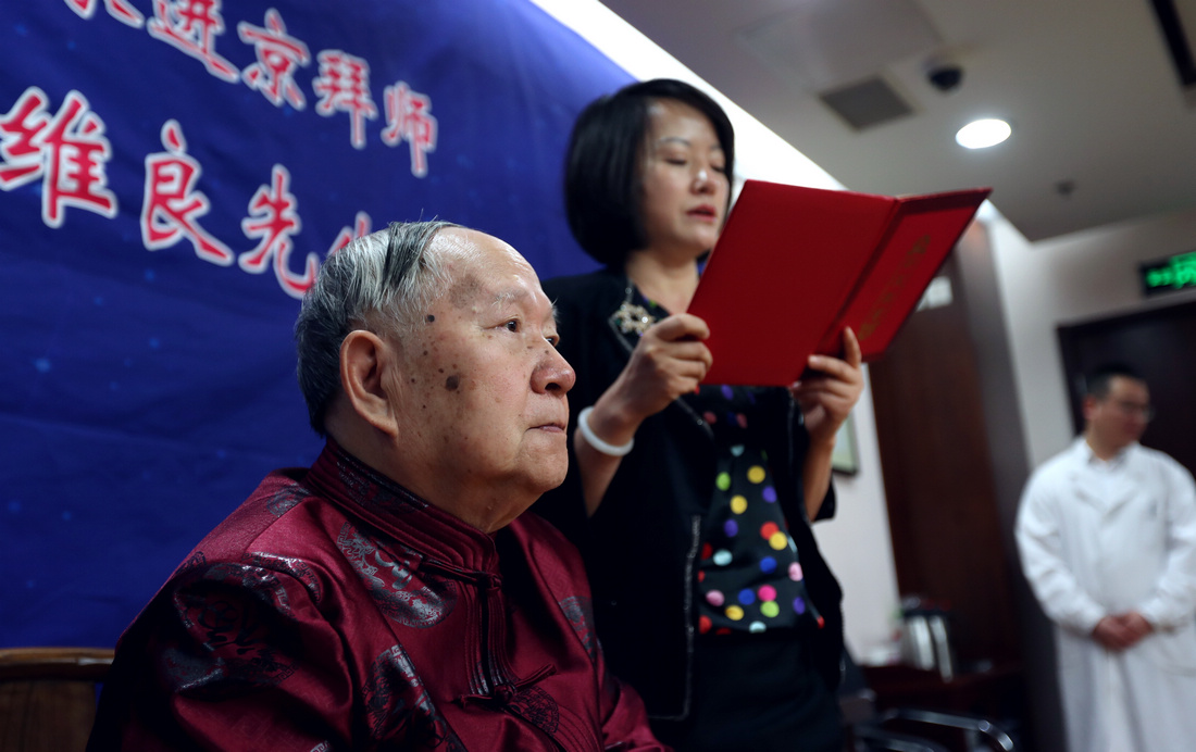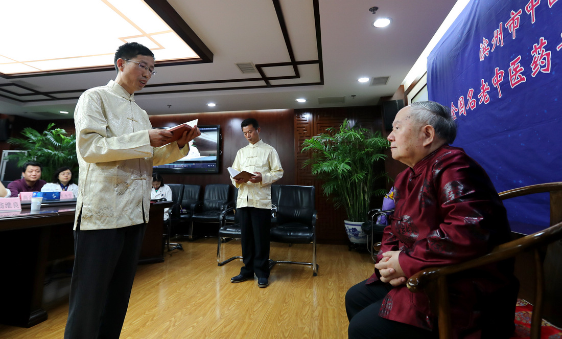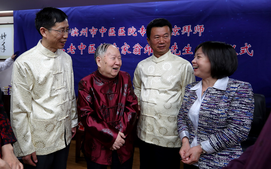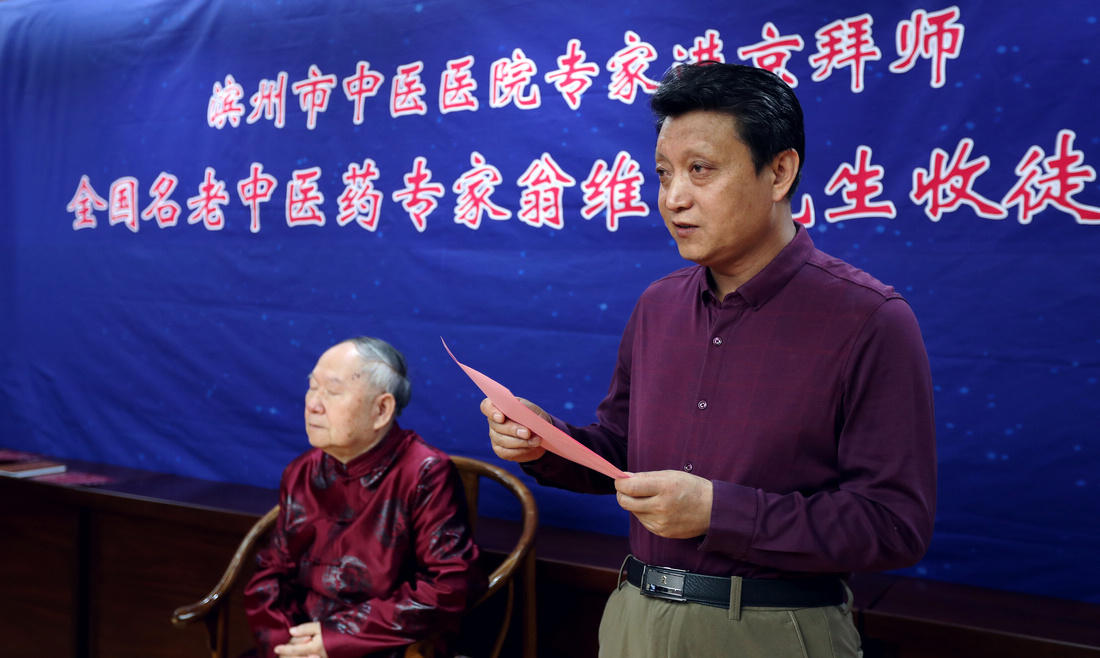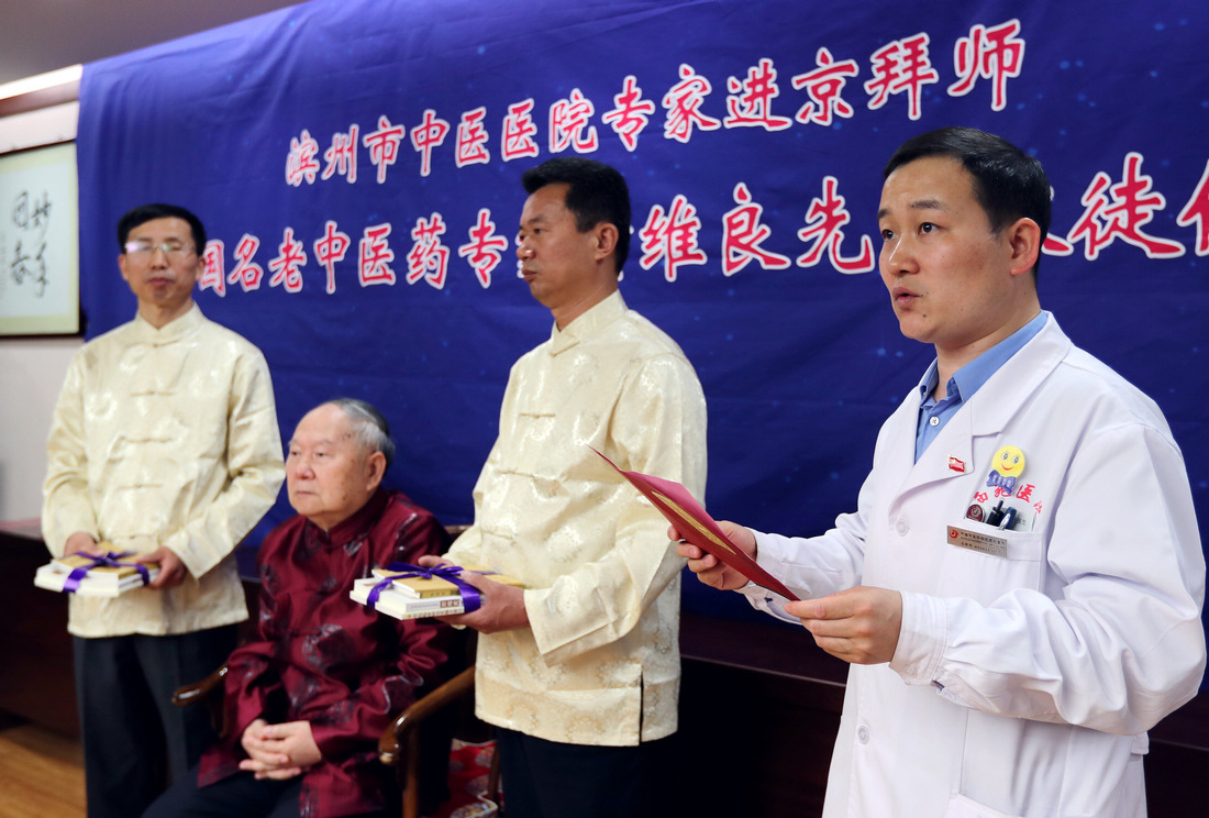 5月9日,滨州市中医医院专家拜师仪式在北京中国中医科学院西苑医院举行。贾在金、吕振军两位滨州中医专家正式拜师81岁高龄的全国名中医、首都国医名师翁维良先生。在滨州市中医医院建立“全国名中医药专家翁维良传承工作室滨州工作站”。中国中医科学院中医药发展研究中心常务副主任苏庆民,滨州市政府副秘书长李杨,滨州市卫生和计划生育委员会党组书记、主任商秀丽,滨州市中医药管理局副局长高金昌,中国中医科学院西苑医院副院长史大卓,中国中医科学院西苑医院副院长李秋艳,中国中医科学院西苑医院教育处处长高铸烨,中国中医科学院西苑医院科研处副处长高蕊、中国中医科学院西苑医院GCP中心副主任陆芳,滨州市中医医院院长张永生,滨州市中医医院副院长杨艳红参加了拜师仪式。