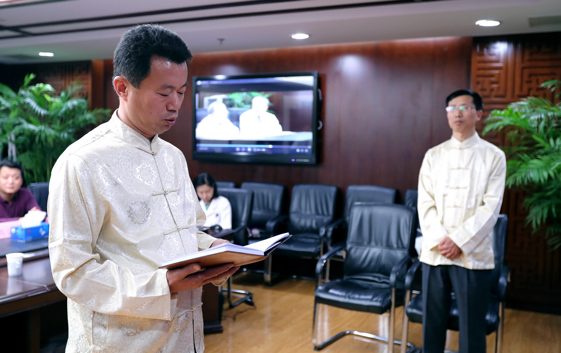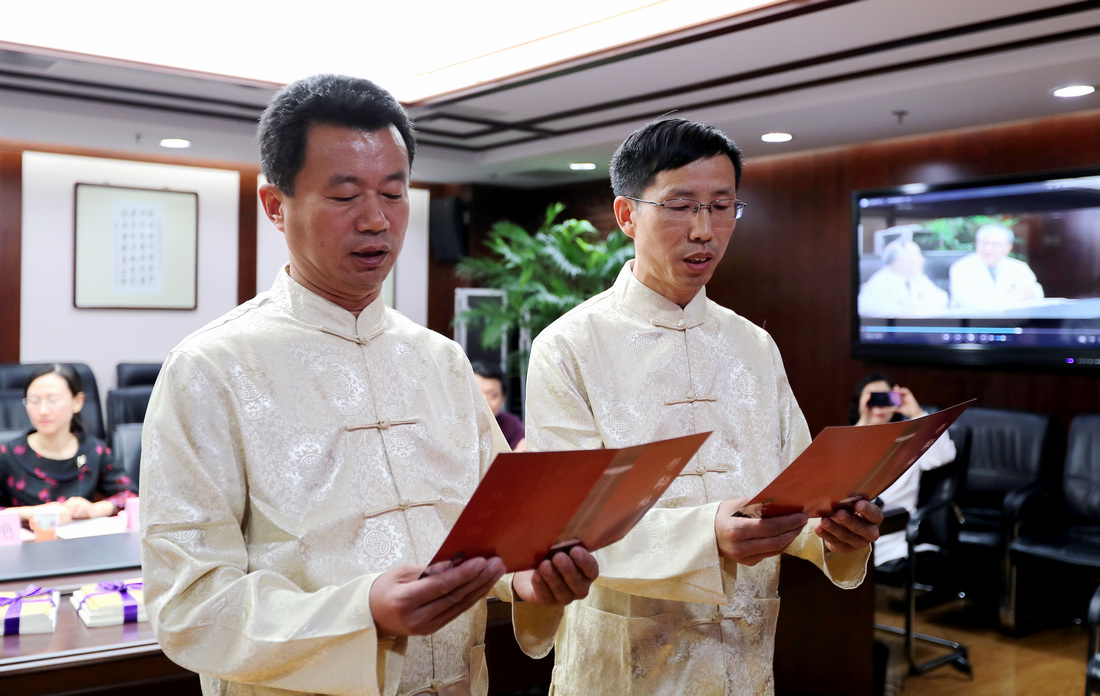 贾在金、吕振军两位专家宣立誓言,表示翁老的学术、为人受人尊敬,提出“活血化瘀十二法”,对预防血管再阻塞、保护心功能和改善心肌组织血液再灌注方面,有明显作用。老师提倡传承与创新并重,提倡在科研中发展中医,形成了自身鲜明的学术特色。他们一定会深入学习翁老的学术思想,努力攀登中医药文化高峰,为推动滨州中医发展,为服务广大滨州市民贡献力量。拜师仪式结束后,两位弟子将开启与翁维良先生的学习之旅。