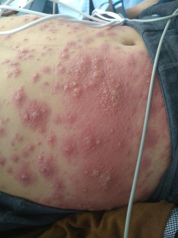 吴先生自述3月5日下午出现周身瘙痒,腰腹部散在数个红色斑丘疹,随即到某医院就诊,被诊为“过敏”而给予“止痒药和药膏(药名不详)”,无明显效果,6日晚间出现发热(T37.6℃),皮疹增多,瘙痒加重等症状。于是,3月7日来我院皮肤科就诊。来就诊时体温39.2℃,仍周身瘙痒,腰腹部及双大腿密集蚕豆至核桃大红色浸润性斑丘疹,斑丘疹上可见小米粒大水疱,时有恶心欲吐,纳眠差,小便黄,大便4日未排。